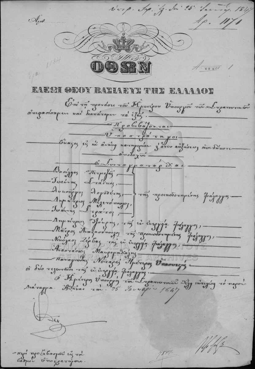 Το βασιλικό Διάταγμα της προαγωγής του Γιαννάκη Στράτου σε υποστράτηγο με υπογραφή του Όθωνα και του υπουργού Στρατιωτικών Κίτσου Τζαβέλα {υπ. στρατ. Μ/Α ,φ. 499 }