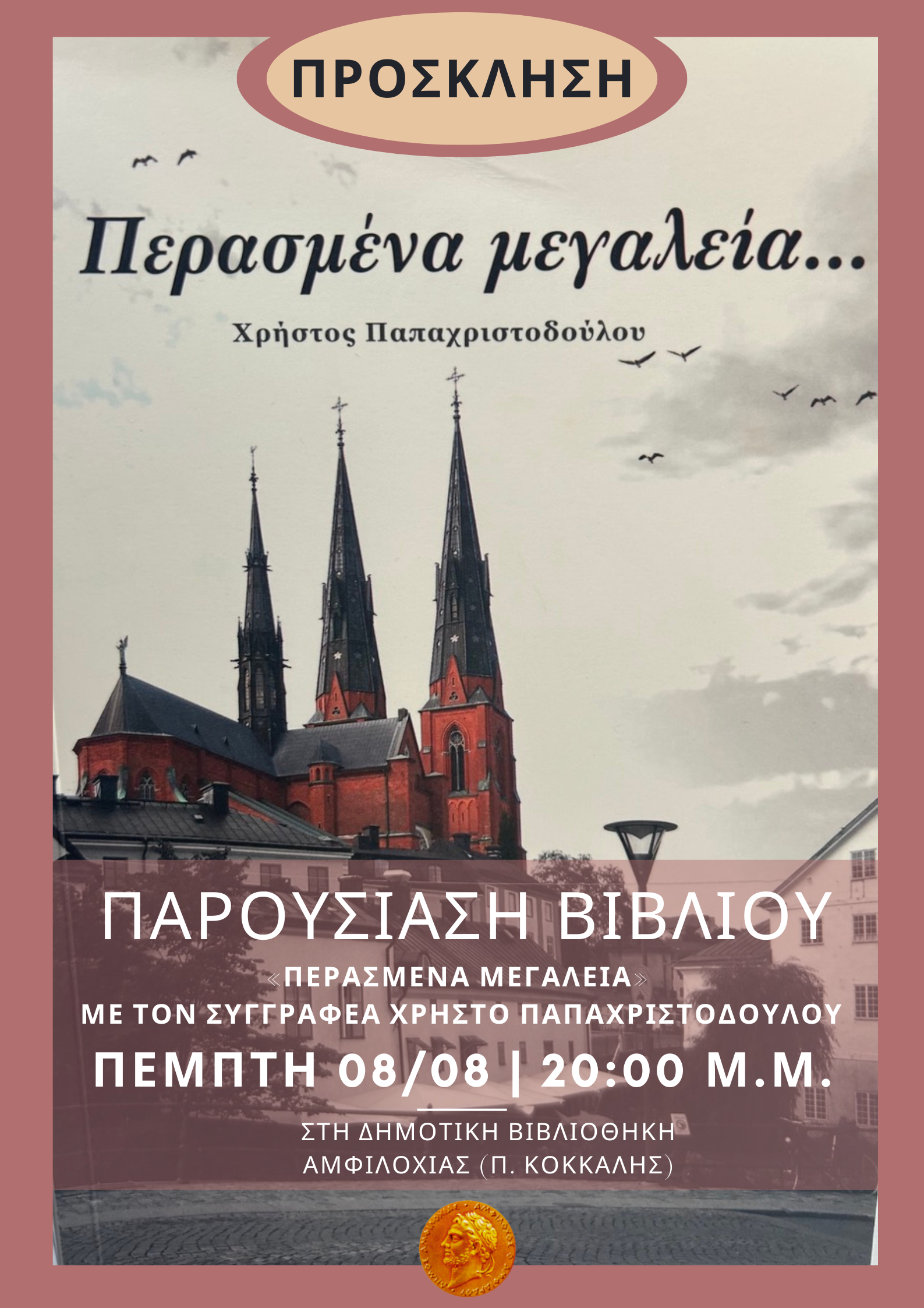 O Δήμος Αμφιλοχίας στο πλαίσιο των «Πανακαρνανείων 2024» σας προσκαλεί την Πέμπτη 08/08 στις 20:00 μ.μ. στην παρουσίαση του βιβλίου «Περασμένα μεγαλεία».