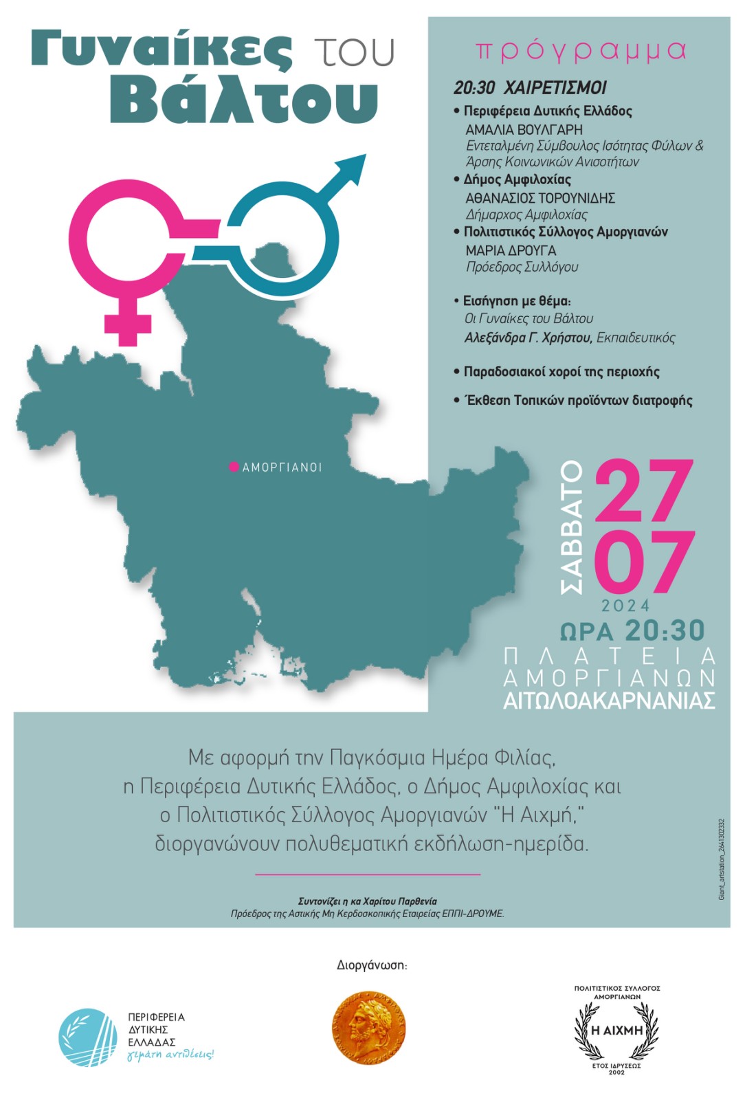 Ο Δήμος Αμφιλοχίας, η Περιφέρεια Δυτικής Ελλάδας και ο Πολιτιστικός Σύλλογος Αμοργιανών ¨Η Αιχμή” συνδιοργανώνουν, το Σάββατο 27 Ιουλίου 2024, πολυθεματική εκδήλωση – εσπερίδα με θέμα «Γυναίκες του Βάλτου», στην πλατεία του χωριού Αμοργιανοί.