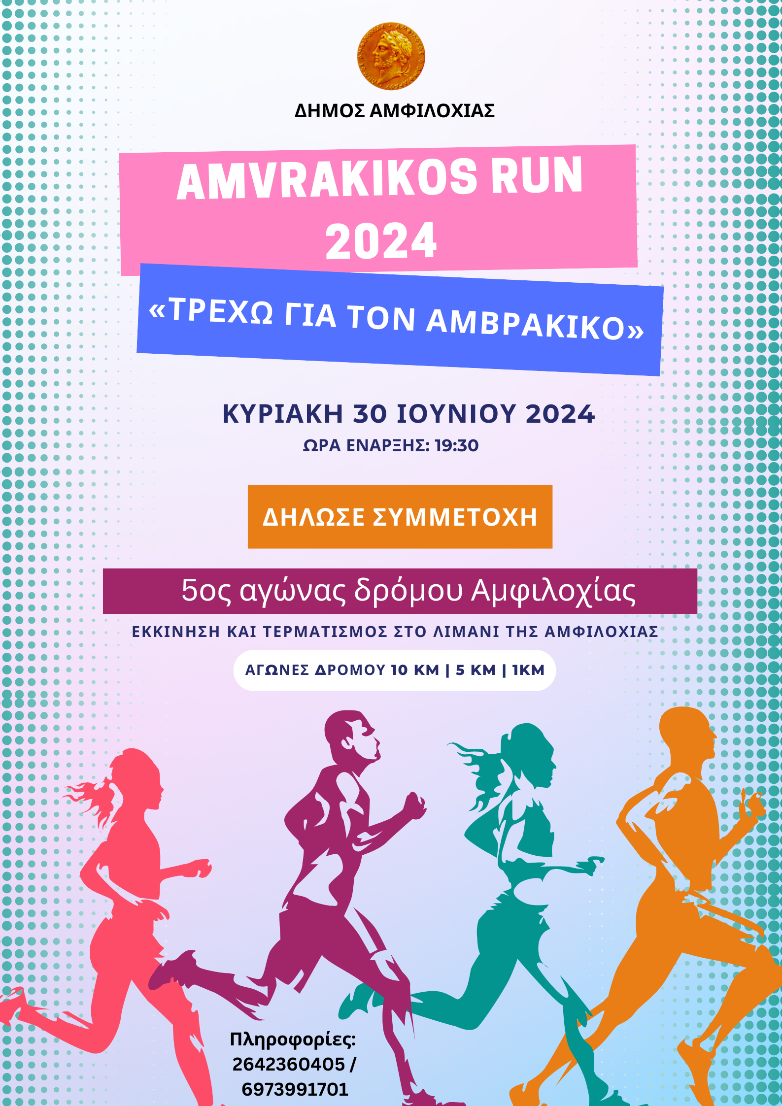 Με μεγάλη συμμετοχή δρομέων θα ξεκινήσει  ο αγώνας δρόμου «Αmvrakikos Run» που διοργανώνει ο Δήμος Αμφιλοχίας την Κυριακή 30 Ιουνίου 20204  για ενήλικες και μαθητές δημοτικού στο λιμάνι της Αμφιλοχίας.