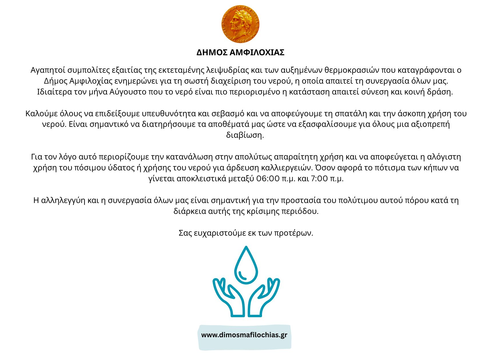 Αγαπητοί συμπολίτες εξαιτίας της εκτεταμένης λειψυδρίας και των αυξημένων θερμοκρασιών που καταγράφονται ο Δήμος Αμφιλοχίας ενημερώνει για τη σωστή διαχείριση του νερού, η οποία απαιτεί τη συνεργασία όλων μας, ιδιαίτερα κατά τον μήνα Αύγουστο, που το διαθέσιμο νερό είναι πλέον περιορισμένο.