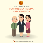ΑΝΑΚΟΙΝΩΣΗ Με αφορμή την Παγκόσμια Ημέρα Τρίτης Ηλικίας που γιορτάζεται κάθε χρόνο 1 Οκτωβρίου, ο Δήμος Αμφιλοχίας διοργανώνει την Τετάρτη 1/10 στις 11:00 π.μ. στην αίθουσα του Κ.Α.Π.Η. ενημερωτική εκδήλωση… Περισσότερα »