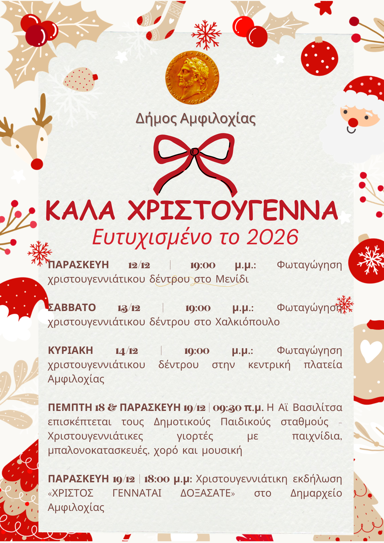 Ο Δήμος Αμφιλοχίας θα υποδεχτεί και φέτος τα Χριστούγεννα με ένα πλούσιο εορταστικό πρόγραμμα, γεμάτο μουσική, χορό και δραστηριότητες για παιδιά, καθώς και με τις καθιερωμένες φωταγωγήσεις των χριστουγεννιάτικων δέντρων στις Δημοτικές Ενότητες Αμφιλοχίας, Ινάχου και Μενιδίου.
