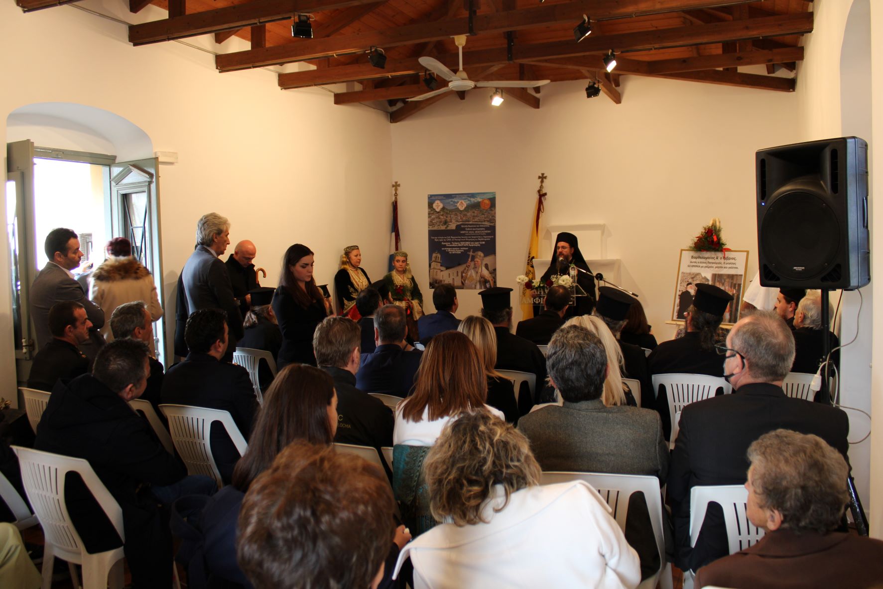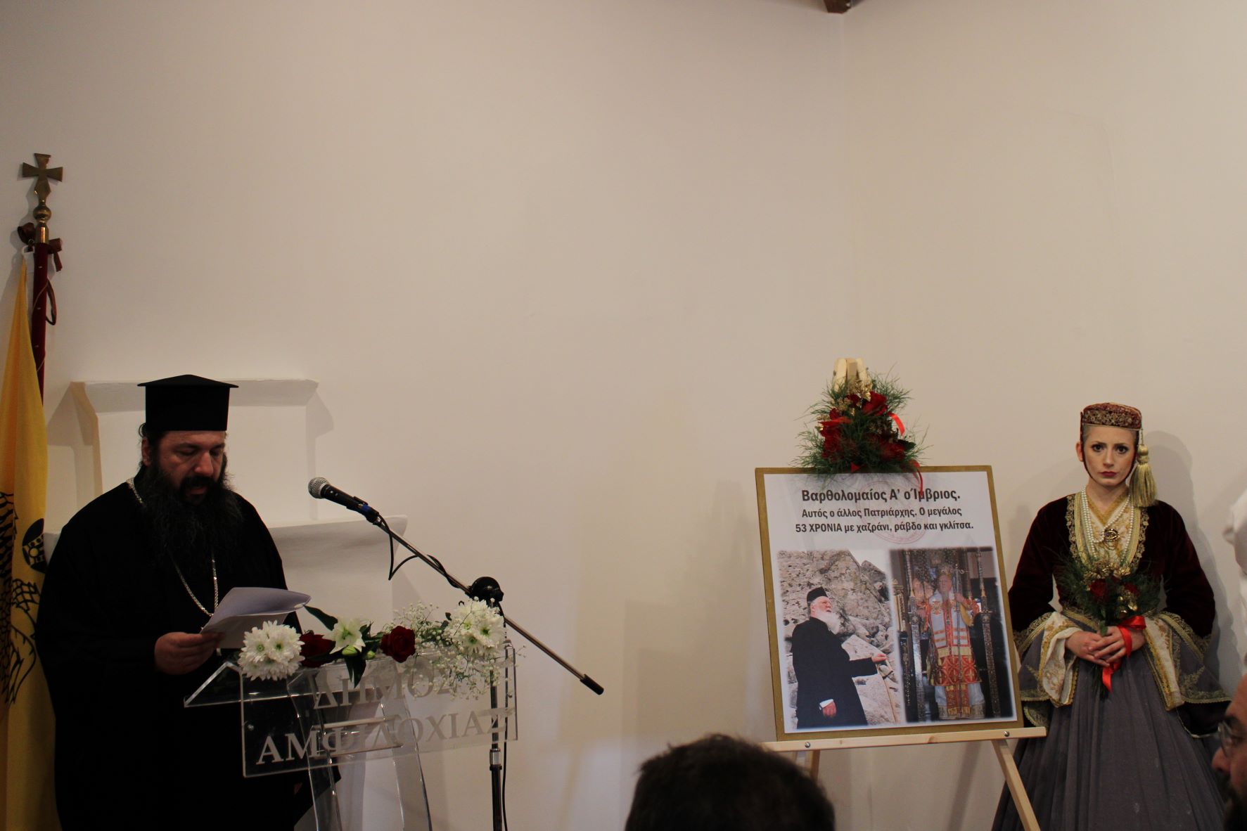 Ακολουθώντας τον εορτασμό και τη λιτάνευση της εικόνας του Αγίου Αθανασίου, πολιούχου της Αμφιλοχίας, πλήθος κόσμου γέμισε ασφυκτικά την επάνω αίθουσα της Πινακοθήκης, όπου πραγματοποιήθηκαν ομιλίες από τον Δήμαρχο Αμφιλοχίας Γιώργο Κατσούλα, τον Περιφερειάρχη Δυτικής Ελλάδας Νεκτάριο Φαρμάκη, τον εμπνευστή της έκθεσης Κωνσταντίνο Τερψίδη και τον Μητροπολίτη Αιτωλίας και Ακαρνανίας κ.κ. Δαμασκηνό. Την εκδήλωση άνοιξε ο Ιερέας του Ιερού Ναού Αγίου Αθανασίου Οδυσσέας Κυρόσιμος, ενώ συντονίστρια ήταν η εκπαιδευτικός Ιφιγένεια Χριστοδούλου. Μέλη του Πολιτιστικού Κέντρου Αμφιλοχίας, ντυμένα με παραδοσιακές φορεσιές, πλαισίωσαν την εκδήλωση δίνοντας έναν ιδιαίτερο τόνο σε αυτή.