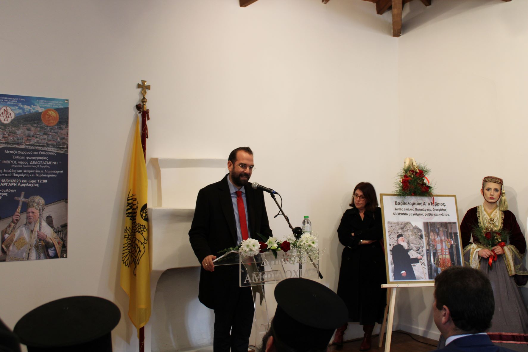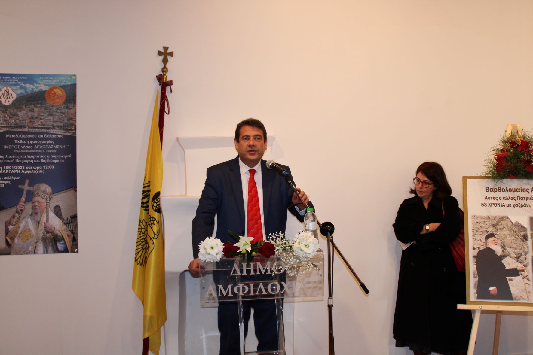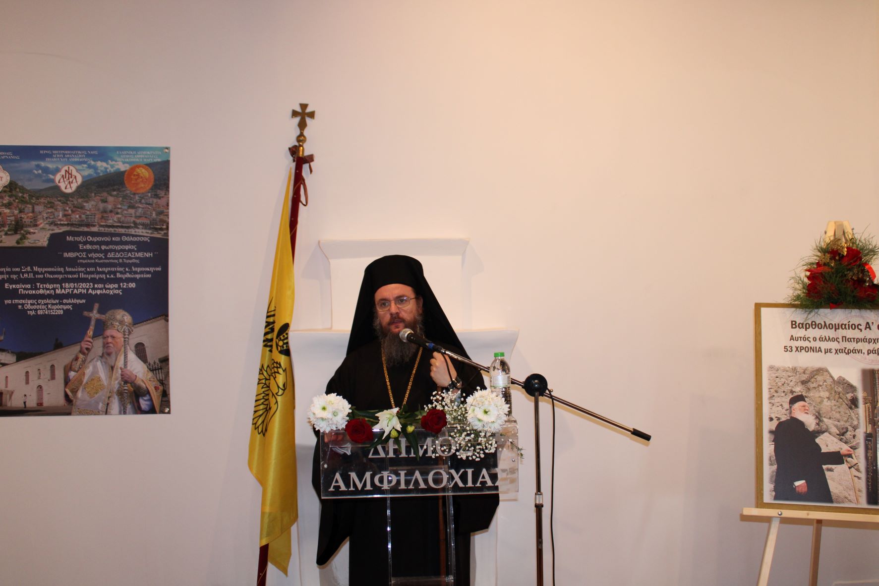 Μια ξεχωριστή έκθεση φωτογραφίας-αφιέρωμα στην Ίμβρο, την ιδιαίτερη πατρίδα του Οικουμενικού Πατριάρχη Βαρθολομαίου, εγκαινιάστηκε από τον Περιφερειάρχη Δυτικής Ελλάδας Νεκτάριο Φαρμάκη και τον Μητροπολίτη Αιτωλίας και Ακαρνανίας κ.κ. Δαμασκηνό, στην Πινακοθήκη Μάργαρη στην Αμφιλοχία, χθες, Τετάρτη 18 Ιανουαρίου 2023.