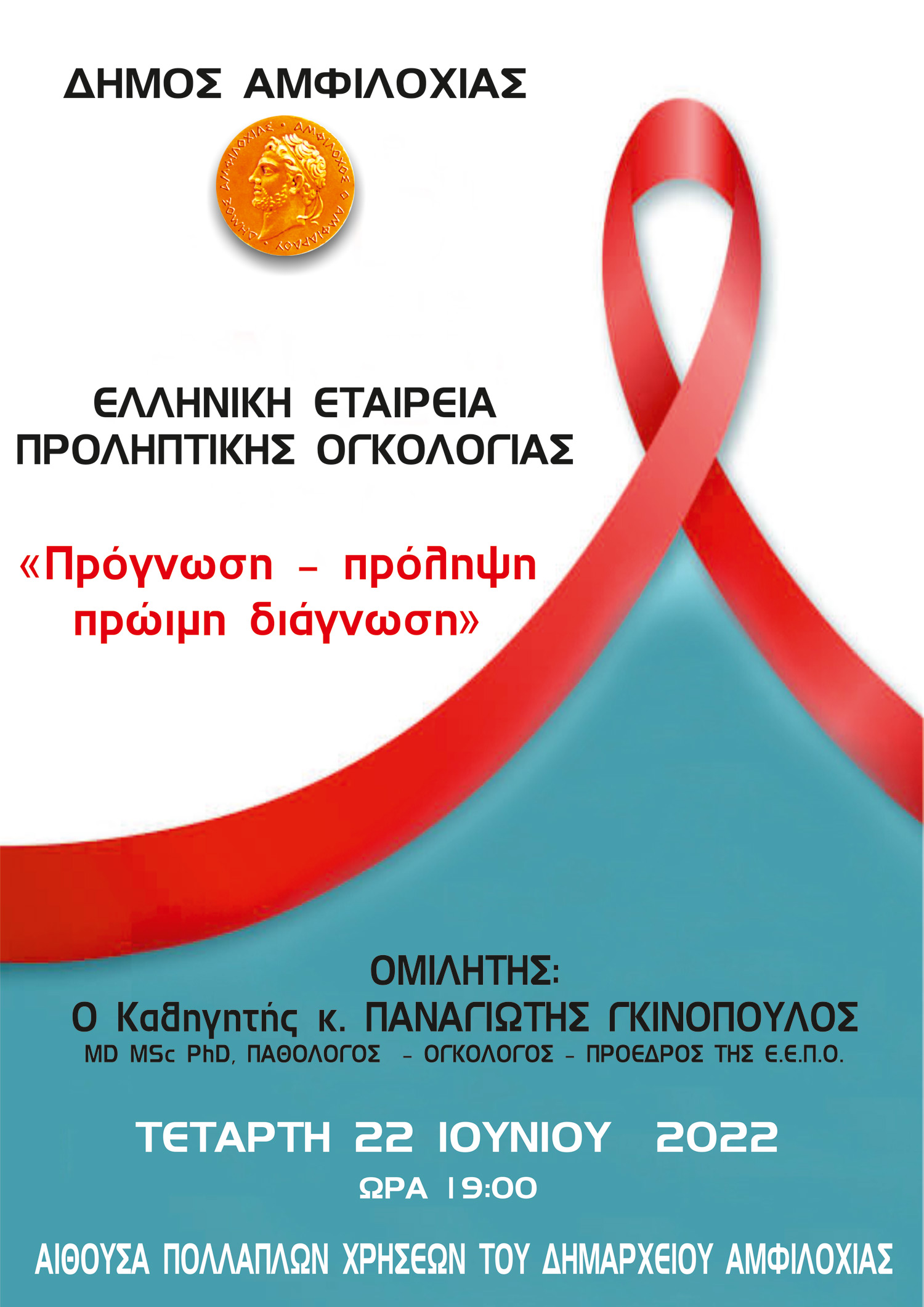 Η ομιλία θα πραγματοποιηθεί την Τετάρτη 22 Ιουνίου 2022 στις 19:00 στην Αίθουσα Πολλαπλών Χρήσεων του Δημαρχείου Αμφιλοχίας (στον ημιώροφο του Δημαρχείου), με σκοπό την ευαισθητοποίηση των πολιτών για την Πρόγνωση-Πρώιμη Διάγνωση και Θεραπεία του Καρκίνου.