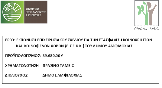 Ο Δήμος Αμφιλοχίας, ολοκλήρωσε την εκπόνηση του «Επιχειρησιακού σχεδίου για την εξασφάλιση κοινόχρηστων και κοινωφελών χώρων (Ε.Σ.Ε.Κ.Κ.) του Δήμου Αμφιλοχίας», στο πλαίσιο του Προγράμματος «Δράσεις Περιβαλλοντικού Ισοζυγίου» 2021 του Πράσινου Ταμείου, στον Άξονα Προτεραιότητας 2 «Αστική Αναζωογόνηση & Λοιπές δράσεις Περιβαλλοντικού Ισοζυγίου», για την δράση «Επιχειρησιακό σχέδιο για την εξασφάλιση κοινόχρηστων και κοινωφελών χώρων – Ε.Σ.Ε.Κ.Κ.», από το οποίο χρηματοδοτείται.