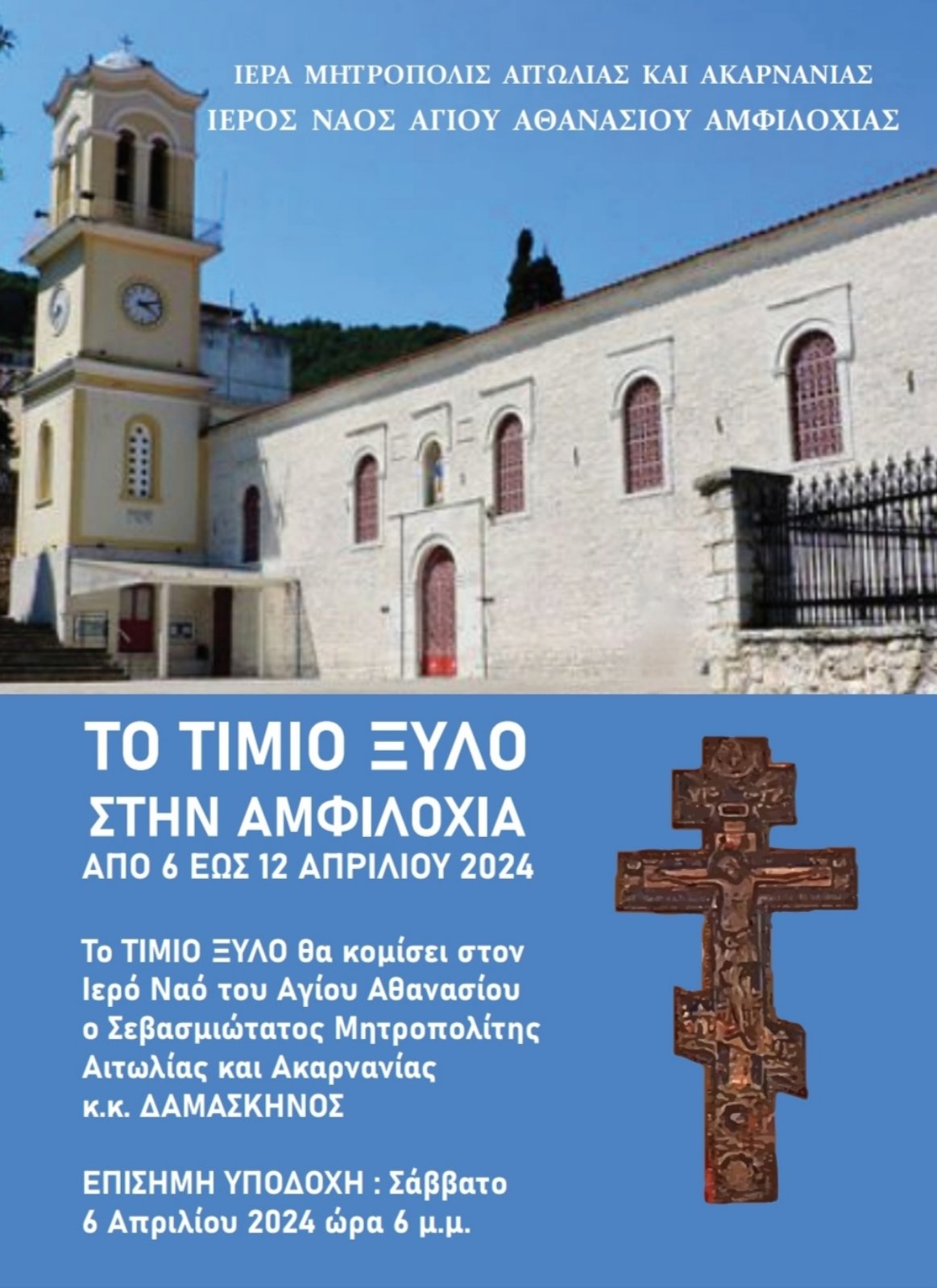 Ο Δήμος Αμφιλοχίας με την Ιερά Μητρόπολη Αιτωλίας και Ακαρνανίας υποδέχονται το Σάββατο 6 Απριλίου στις 18:00 μ.μ. στην Αμφιλοχία το Τίμιο Ξύλο.