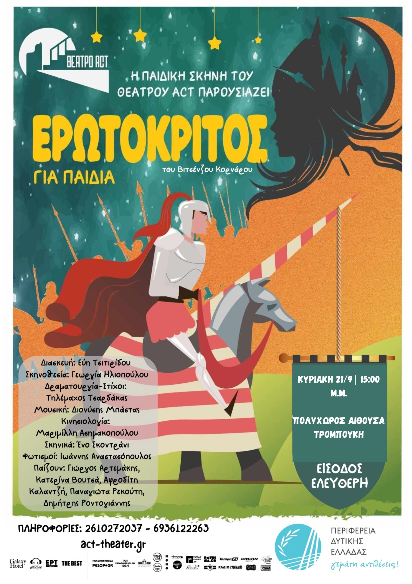 Ο Δήμος Αμφιλοχίας φιλοξενεί την Κυριακή 21/9 στις 15:00 στην Αμφιλοχία την παράσταση του κλασσικού έργου «ΕΡΩΤΟΚΡΙΤΟΣ» που παρουσιάζουν η Περιφέρεια Δυτικής Ελλάδας σε συνεργασία με την επαγγελματική θεατρική ομάδα Κάνθαρος του θεάτρου act .