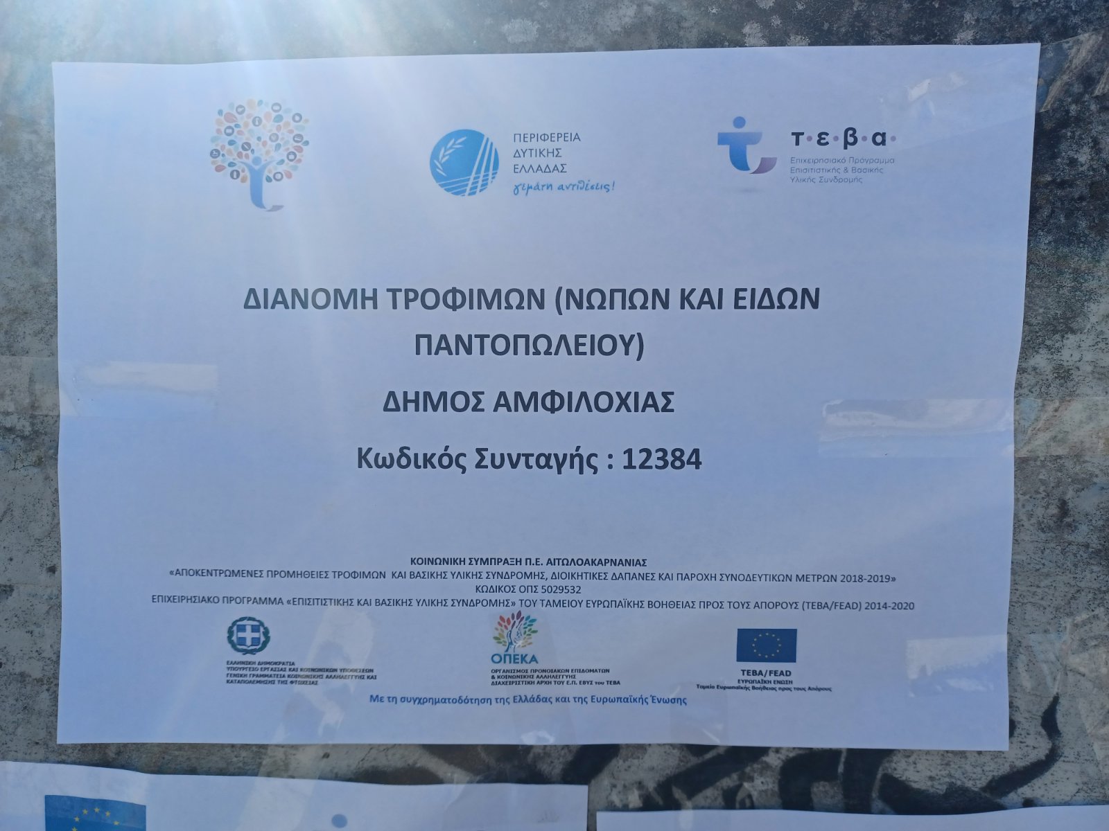 Ευχαριστήριο Δήμου Αμφιλοχίας σε Περιφέρεια και φορείς για τη διανομή του ΤΕΒΑ
