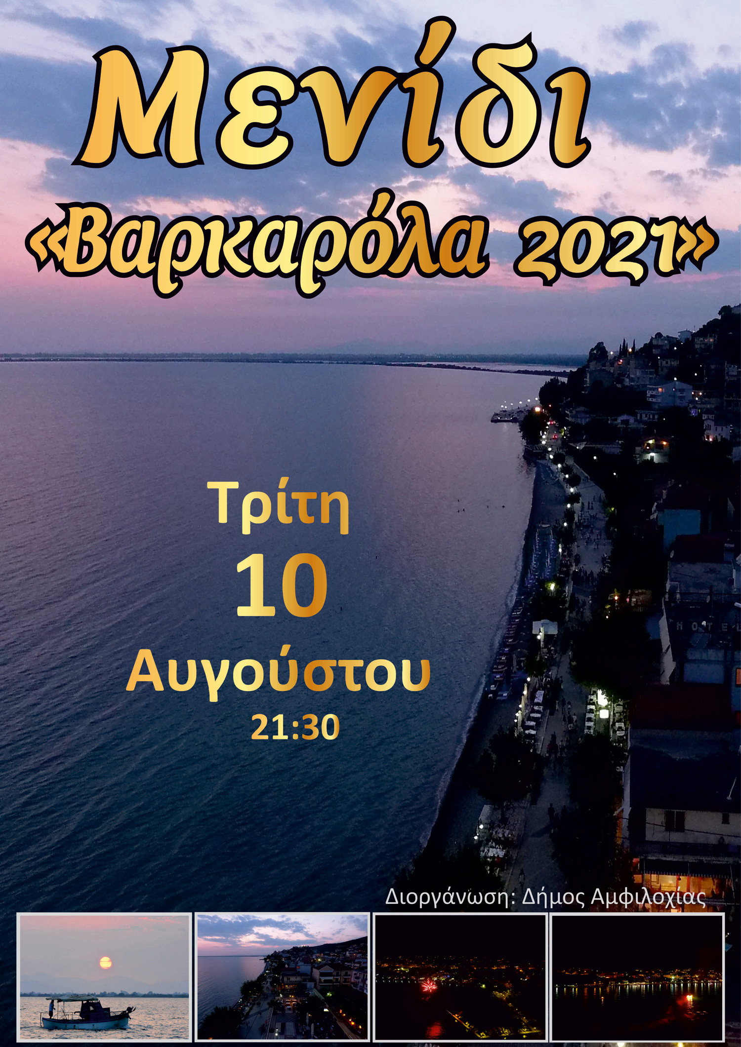 Ο Δήμος Αμφιλοχίας, λόγω τεχνικών ζητημάτων, μεταφέρει  την προγραμματισμένη Βαρκαρόλα του Μενιδίου την Τρίτη 10 Αυγούστου 2021 στις 21:30 (αντί του Σαββάτου 7 Αυγούστου).