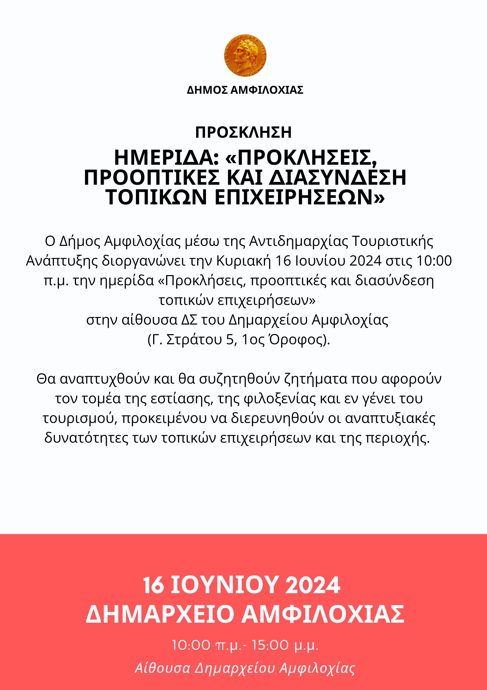 Ο Δήμος Αμφιλοχίας μέσω της Αντιδημαρχίας Τουριστικής Ανάπτυξης διοργανώνει την Κυριακή 16 Ιουνίου 2024 στις 10:00 π.μ. την ημερίδα «Προκλήσεις, προοπτικές και διασύνδεση τοπικών επιχειρήσεων» στην αίθουσα ΔΣ του Δημαρχείου Αμφιλοχίας