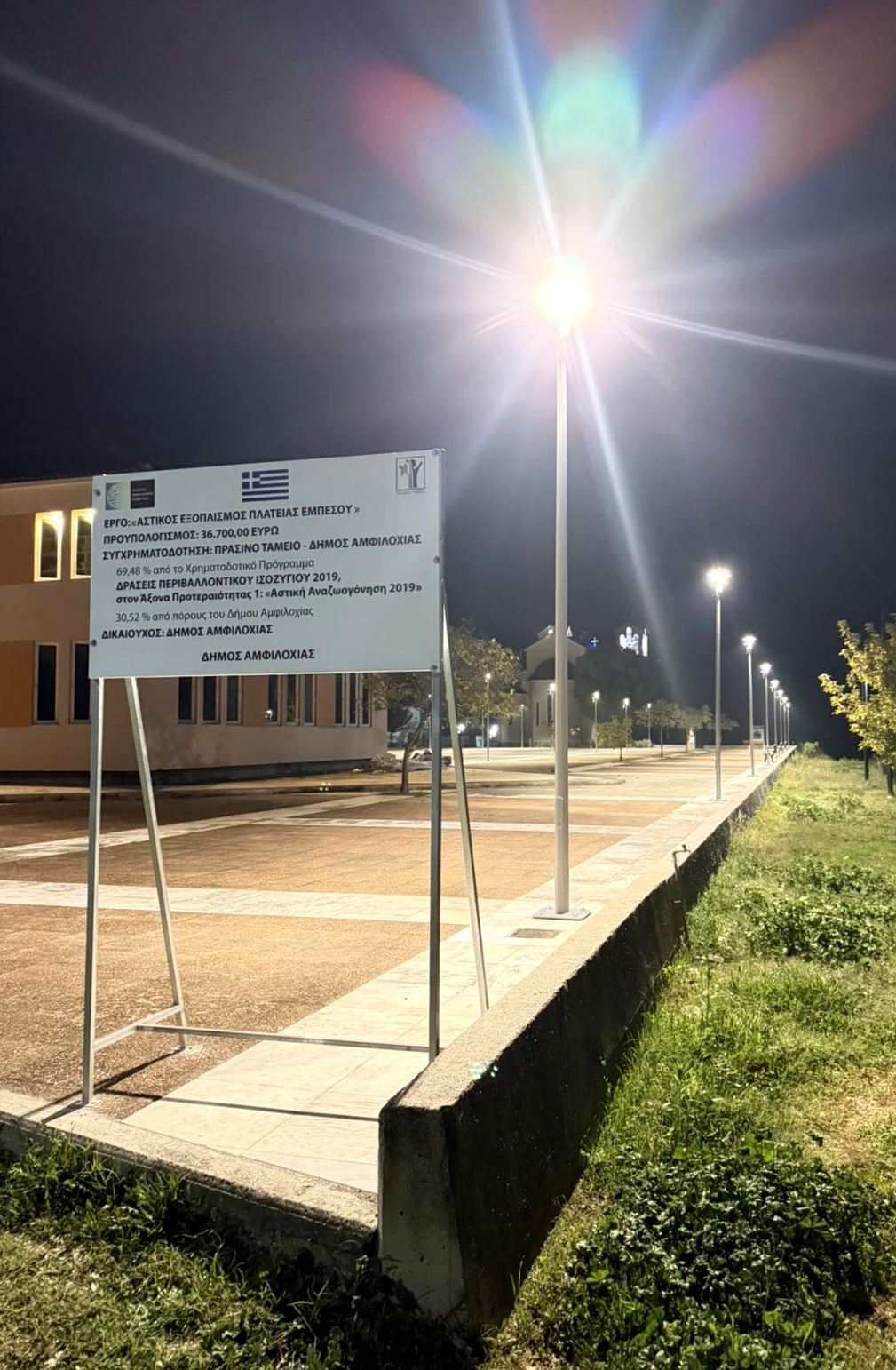 Ολοκληρώθηκε η υλοποίηση του έργου «Αστικός εξοπλισμός πλατείας Εμπεσού» που είχε ενταχθεί στο χρηματοδοτικό πρόγραμμα του Πράσινου Ταμείου «∆ράσεις Περιβαλλοντικού Ισοζυγίου 2019» από τον Δήμο Αμφιλοχίας για τον ηλεκτροφωτισμό της κεντρικής πλατείας του χωριού Εμπεσού.