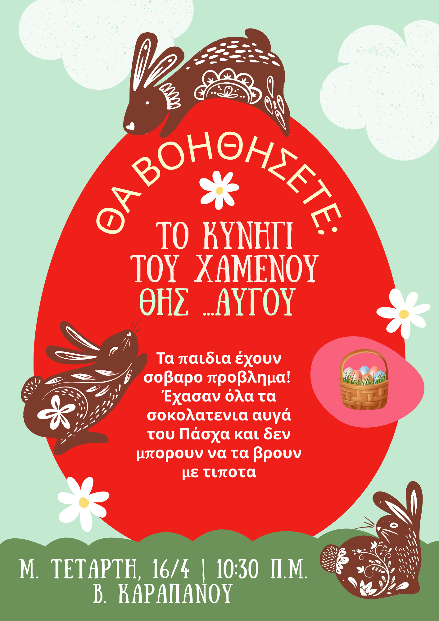 Οι δύο δράσεις θα ξεκινήσουν στην οδό Β. Καραπάνου στις 10:30 π.μ. με το διαδραστικό παιχνίδι «Το κυνήγι του χαμένου θησ…αυγού», όπου τα παιδιά μαθαίνουν την ιστορία της πόλης τους μέσα από γρίφους αναζητώντας τα σοκολατένια αυγά του Πάσχα.