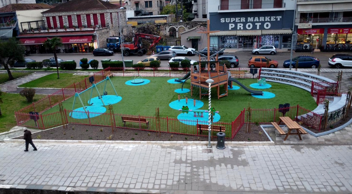 Η παιδική χαρά παραδόθηκε σήμερα προς χρήση μετά την αντικατάσταση οργάνων, τη συντήρηση εξοπλισμού, την αντικατάσταση του δαπέδου με ειδικό δάπεδο ασφαλείας και τη διαμόρφωση του περιβάλλοντα χώρου με διακοσμητικά φυτά, δέντρα, κάδους και παγκάκια.