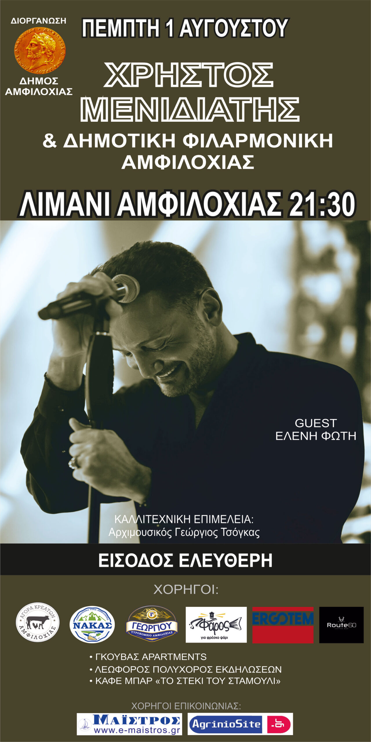 Ο Δήμος Αμφιλοχίας στο πλαίσιο των Πανακαρνανείων 2024 διοργανώνει την Πέμπτη 1 Αυγούστου 2024 συναυλία με τη Δημοτική Φιλαρμονική Αμφιλοχίας και τον Χρήστο Μενιδιάτη στο