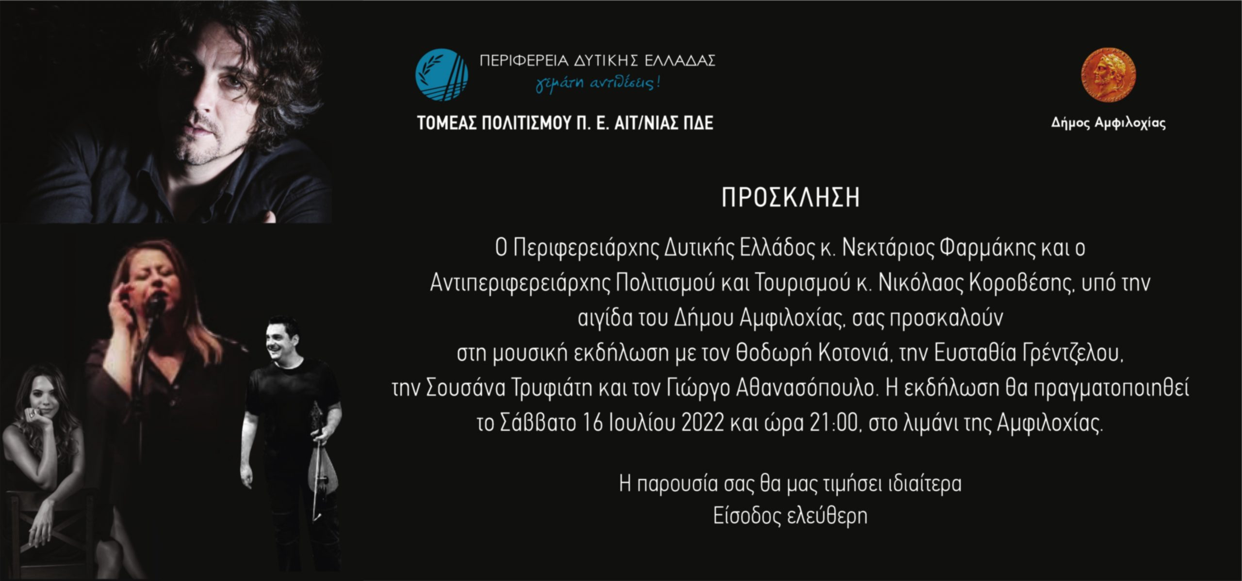 Ο Περιφερειάρχης Δυτικής Ελλάδας κ. Νεκτάριος Φαρμάκης και ο Αντιπεριφερειάρχης Πολιτισμού και Τουρισμού κ. Νικόλαος Κοροβέσης υπό την αιγίδα του Δήμου Αμφιλοχίας διοργανώνει μουσική εκδήλωση με τον Θοδωρή Κοτονιά, την Ευσταθία Γρέντζελου, τη Σουσάνα Τρυφιάτη και τον Γιώργο Αθανασόπουλο στο Λιμάνι της πόλης της Αμφιλοχίας.