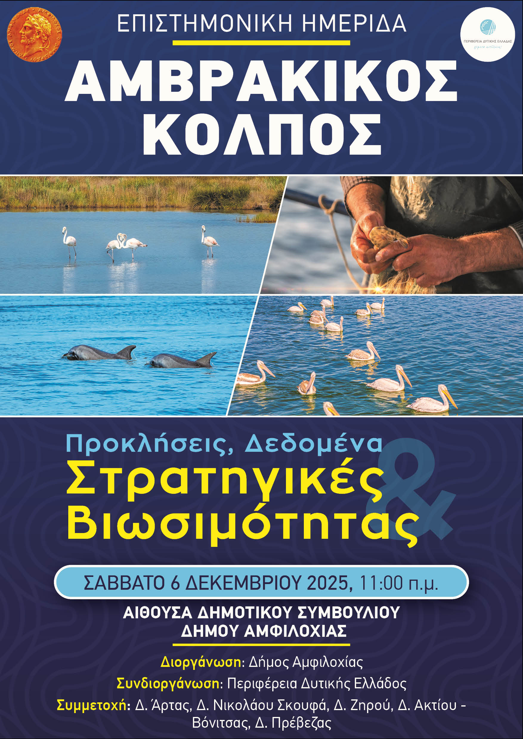 Το Σάββατο 6 Δεκεμβρίου η επιστημονική ημερίδα για τον Αμβρακικό Κόλπο και τις Στρατηγικές Βιωσιμότητας από τον Δήμο Αμφιλοχίας σε συνεργασία με την Περιφέρεια Δυτικής Ελλάδας